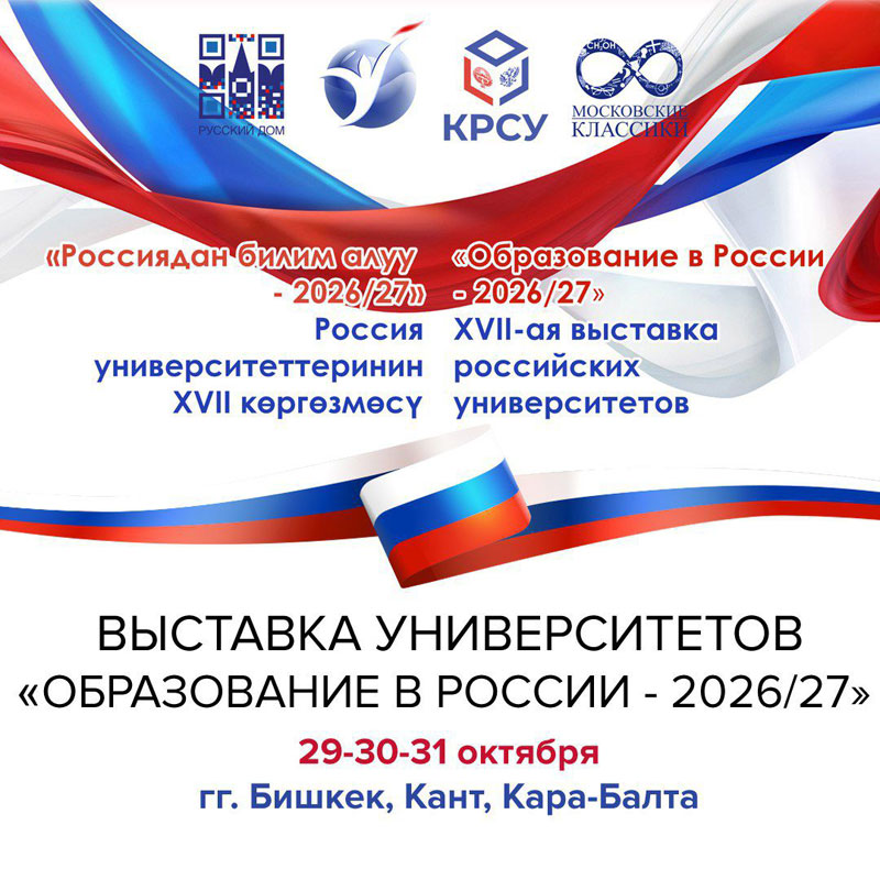 С 29 по 31 октября 2025 г. в городах Бишкек, Кант и Кара-Балта состоится выставка российских университетов «Образование в России –2026/27». Выставка проходит в рамках Форума руководителей вузов Кыргызской Республики и продолжающегося приёма документов на обучение в российских вузах по квотам Правительства России.Выставка будет интересна для учащихся 10-х – 11-х классов, будущих магистрантов и аспирантов. Это уникальная возможность пообщаться напрямую с представителями вузов и узнать об образовательных программах, студенческой жизни и возможностях построения карьеры.