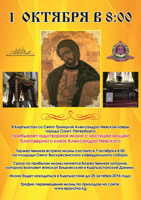 График перемещения иконы св. блгв. кн. Александра Невского по храмам Бишкекской и Кыргызстанской епархии с 01.10.2016 по 25.10.2016 смотрите на фото с низу.