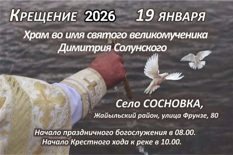 19 января 2026 года в селе Сосновка Жайыльского района Чуйской области состоятся традиционные праздничные мероприятия, посвящённые одному из главных христианских праздников - Крещению Господню, или Святому Богоявлению.Настоятель храма святого великомученика Димитрия Солунского, протоиерей Александр Мезенцев, вместе с прихожанами приглашает всех православных верующих и гостей принять участие в крещенских торжествах.