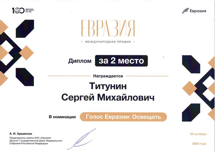 В 2025 году общественный деятель, журналист и популяризатор русской культуры в Кыргызстане Сергей Михайлович Титунин удостоен высокого международного признания - он стал лауреатом Международной премии «ЕВРАЗИЯ» в престижной номинации «Голос Евразии».