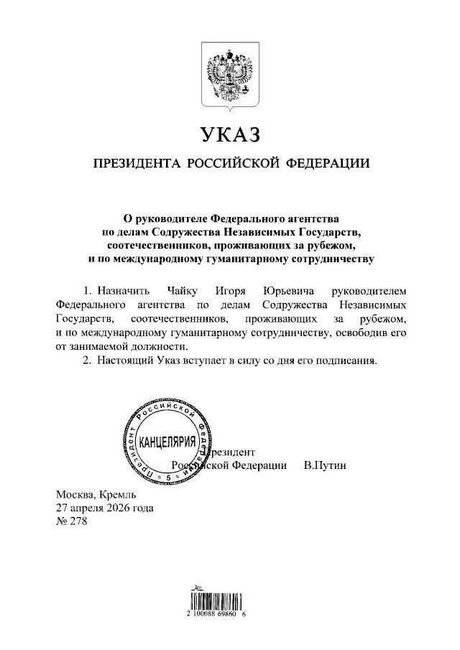 Президент Российской Федерации Владимир Владимирович Путин подписал Указ №278 о назначении Игорь Юрьевич Чайка руководителем Федеральное агентство по делам СНГ, соотечественников, проживающих за рубежом, и по международному гуманитарному сотрудничеству (Россотрудничество). Документ вступил в силу со дня подписания - 27 апреля 2026 года.Назначение нового главы ключевого ведомства, отвечающего за развитие гуманитарных связей России за рубежом, происходит в условиях непростой международной обстановки. Сегодня Россотрудничество играет важную роль в поддержке соотечественников, продвижении русского языка, культуры и образования, а также укреплении партнерских связей со странами СНГ и другими государствами.